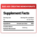 Unleash your inner beast with BAD ASS® Creatine Monohydrate. This is not for the faint of heart. Formulated for the most dedicated athletes, this supplement delivers pure, micronized creatine monohydrate to fuel your muscles for explosive strength, power, and size. If you’re ready to dominate your workouts and build a formidable physique, this is your foundational tool.