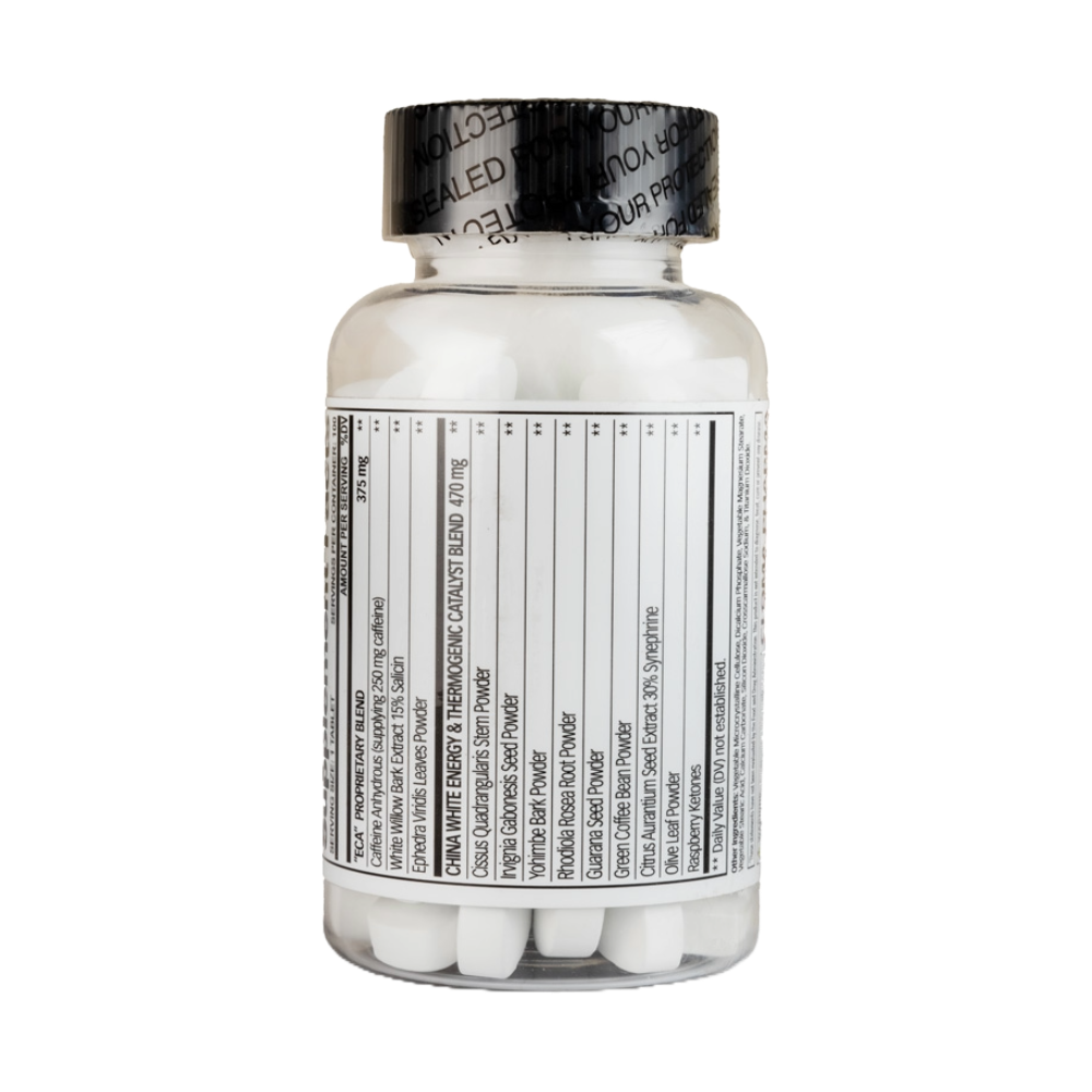 – China White Proprietary Blend (470mg): Rhodiola Rosea, Acacia Rigadula, Methylsynephrine, Irvingia Gabonensis, Yohimbe Extract, Guarana, Green Coffee Bean, Raspberry Ketones, Cissus Quadrangularis, Olive Leaf Extract.