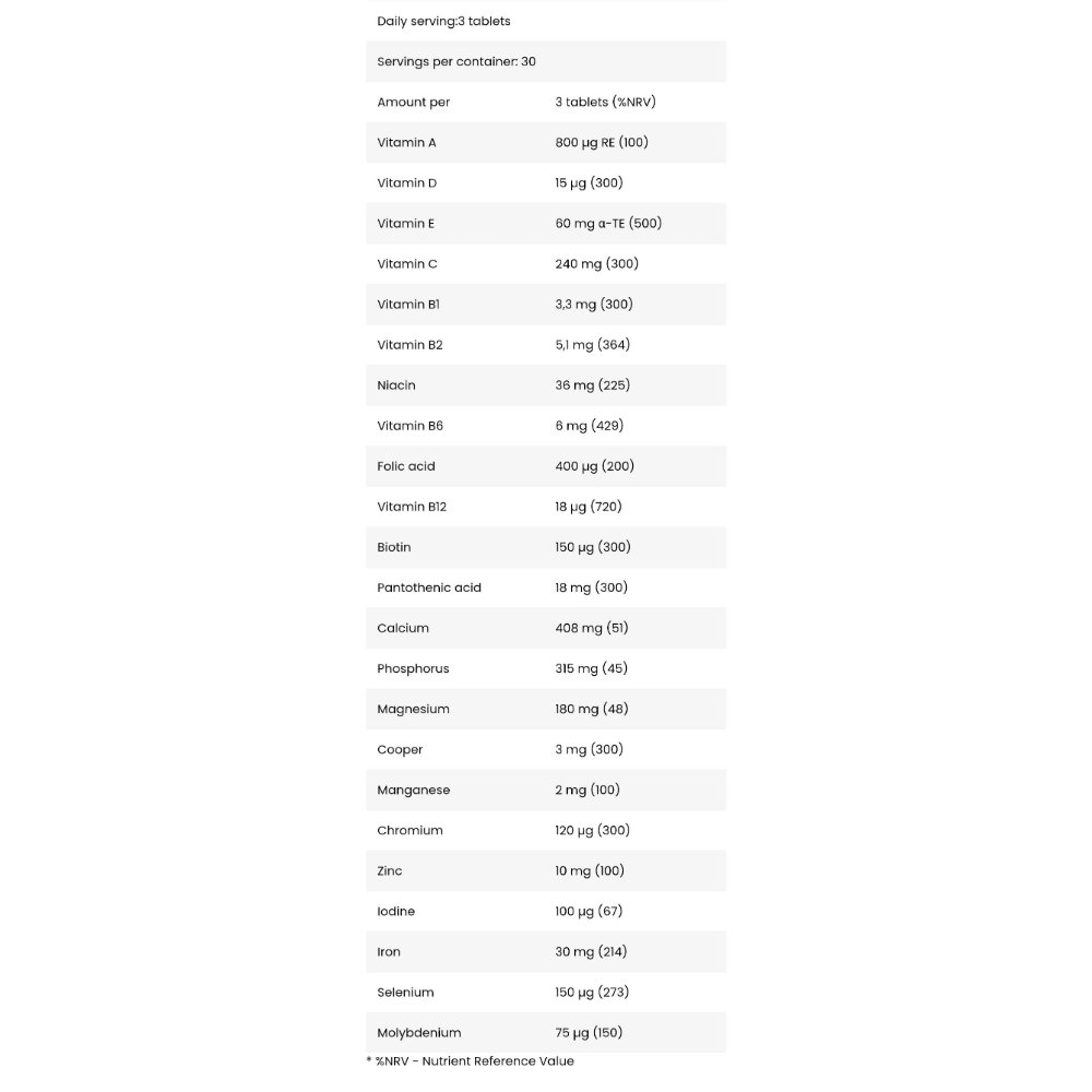 Ingredients: dicalcium phosphate, bulking agent (E460(i)), magnesium oxide, vitamin C (L-ascorbic acid), stabilizers (E1202, E1201), anti-caking agents (E551, E470b), vitamin E (DL-alpha-tocopherol), ferrous fumarate, niacin (nicotinamide), glazing agent (E1521), etc.