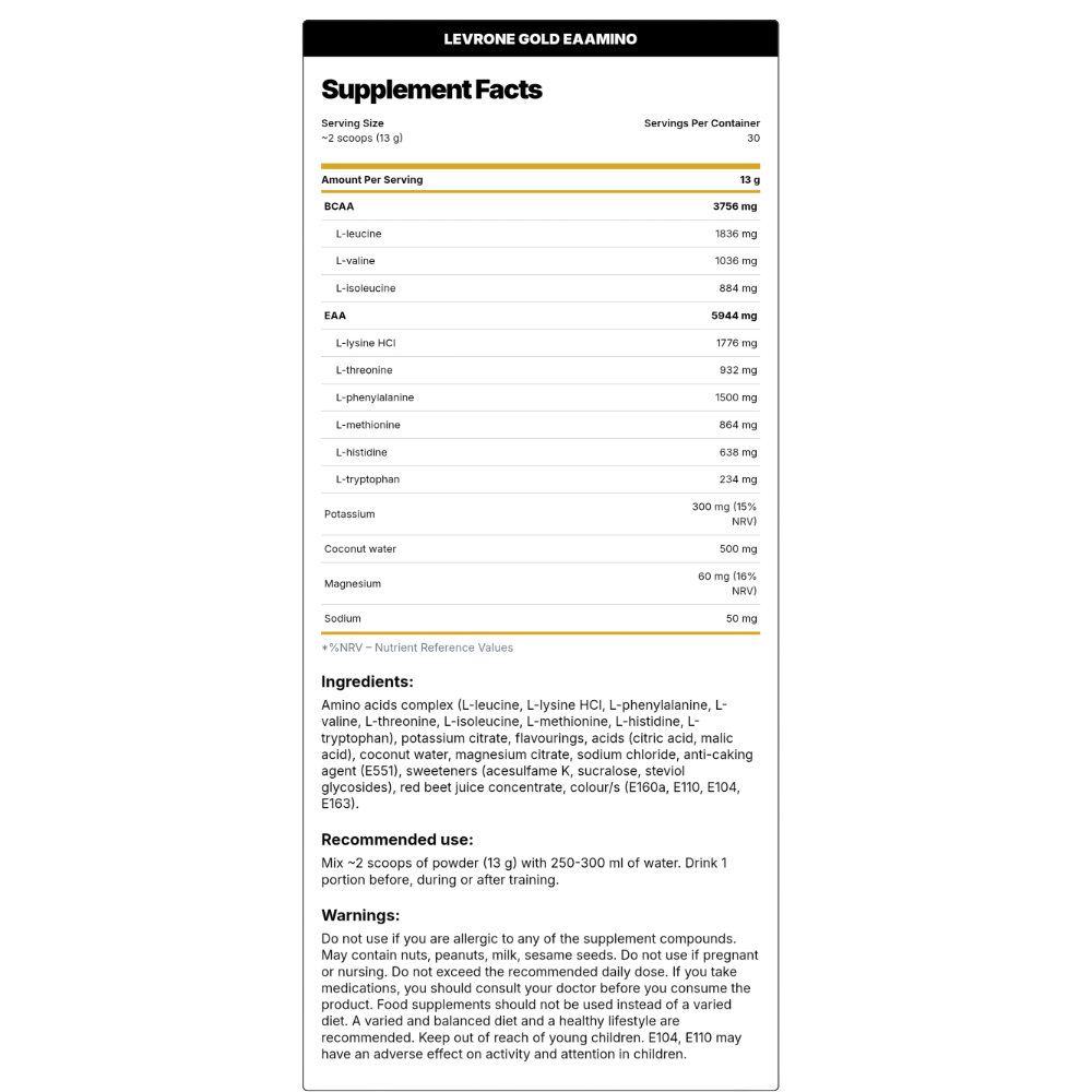 Fuel your workouts with LEVRONE GOLD EAAMINO, a premium pre/post-workout amino acid formula designed for dedicated strength training athletes and physically active individuals. This advanced supplement supports normal muscle function, helps maintain electrolyte balance, and contributes to normal protein synthesis, making it the ultimate tool for recovery and performance.