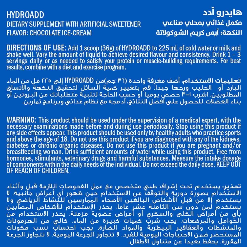 - Mix: Add 1 scoop (36g) of HYDROADD to 225 ml of cold water or milk.