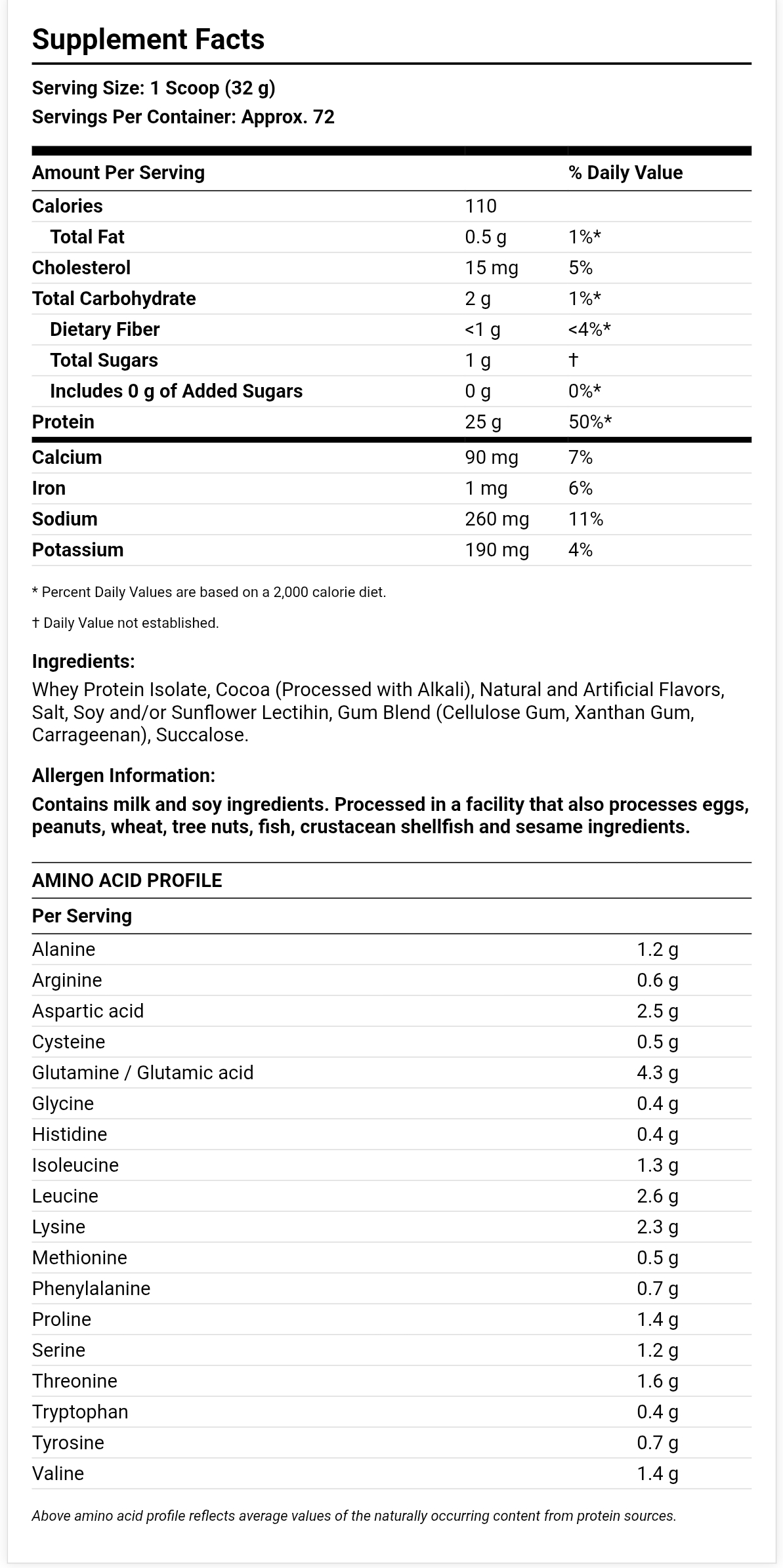 Fuel your muscles with this premium Whey Protein Isolate in a classic Chocolate flavor. Engineered for purity and performance, it delivers a massive 25g of high-quality protein per serving with only 110 calories. This formula is perfect for post-workout recovery, helping you build lean muscle and achieve your fitness goals faster.