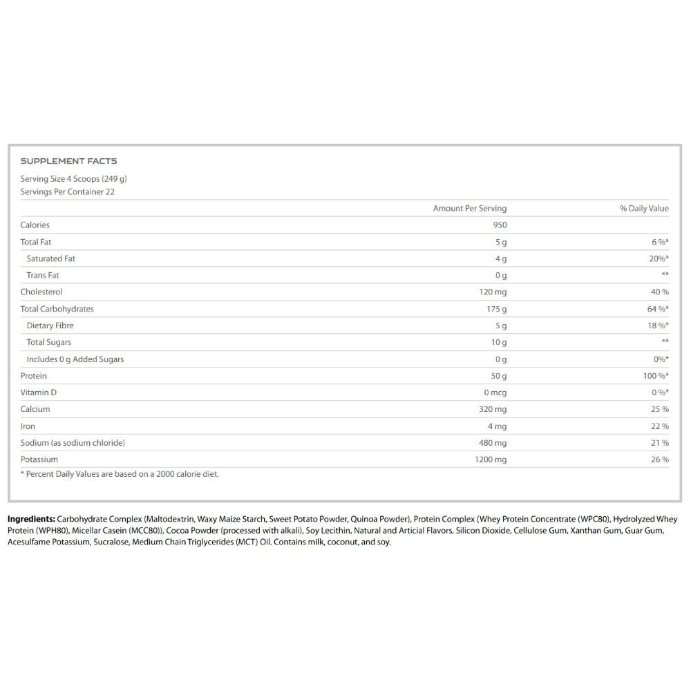 Ingredients: Carbohydrate Complex (Maltodextrin, Waxy Maize Starch, Sweet Potato Powder, Quinoa Powder), Protein Complex (Whey Protein Concentrate (WPC80), Hydrolyzed Whey Protein (WPH80), Micellar Casein (MCC80)), Cocoa Powder (processed with alkali), Soy Lecithin, Natural and Artificial Flavors, Silicon Dioxide, Cellulose Gum, Xanthan Gum, Guar Gum, Acesulfame Potassium, Sucralose, Medium Chain Triglycerides (MCT) Oil.