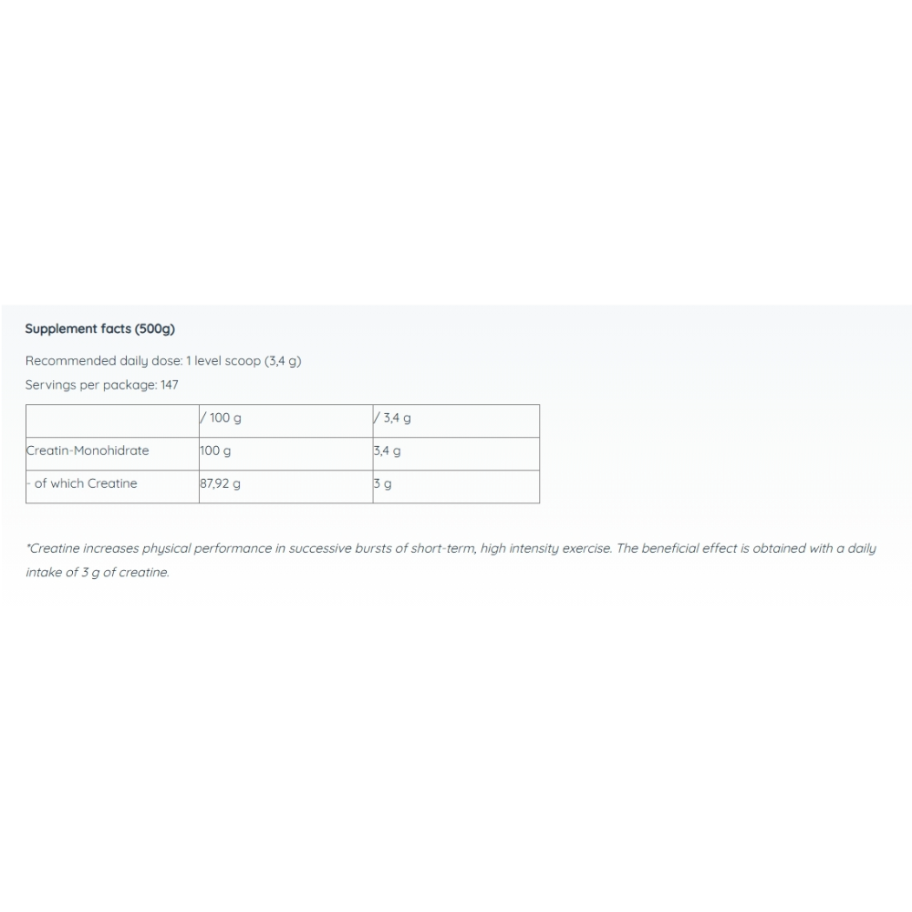 - Mix: Mix one serving (3,4 g) of Creatine Monohydrate powder in 200 ml of water.