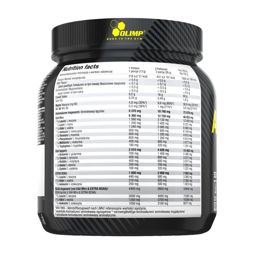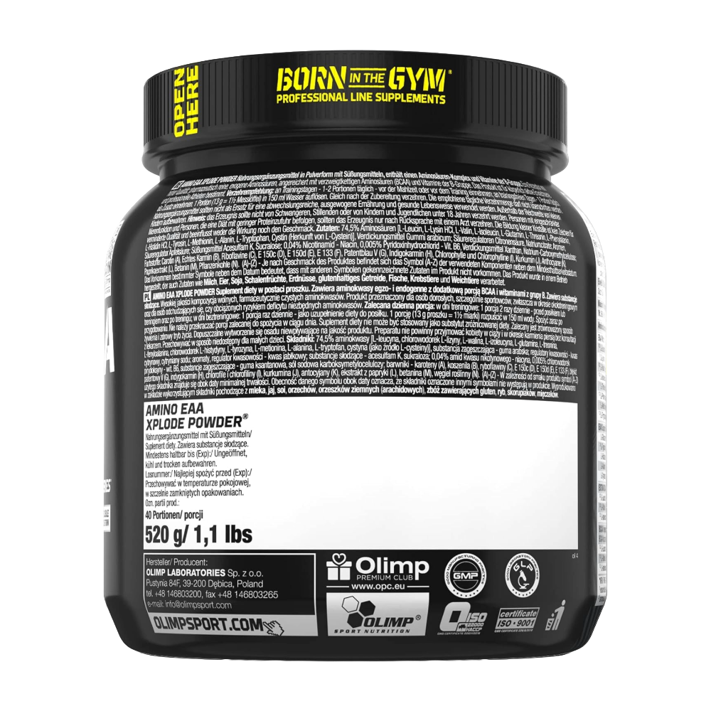 Olimp Amino EAA Xplode Powder is a high-quality food supplement from the Black Series, designed for physically active adults and professional athletes. This modern formula provides a complete complex of essential amino acids (EAA) in an extra soluble form. With 9370 mg of amino acids per portion, it’s engineered to support your body’s needs, especially during intense training periods.