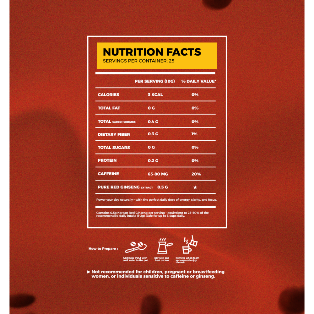 Power your day naturally with Snackraw Raw Volt, the perfect daily dose of energy, clarity, and focus. This unique coffee blend is infused with Pure Red Ginseng to provide a natural boost to your energy levels and sharpen your mental focus, all in a delicious and easy-to-prepare drink.