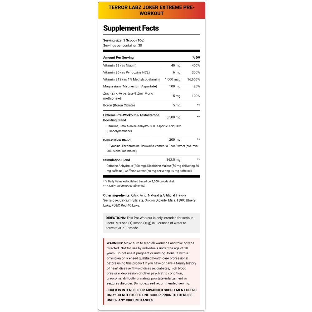 Go beyond evil, beyond insanity… there is JOKER. This extreme pre-workout from Terror Labz is an incredibly powerful formula, intended only for advanced athletes seeking the most intensely productive workouts possible. With a potent combination of energy, pump, and testosterone-boosting ingredients, Joker is designed to help you activate your inner maniac and dominate the gym.