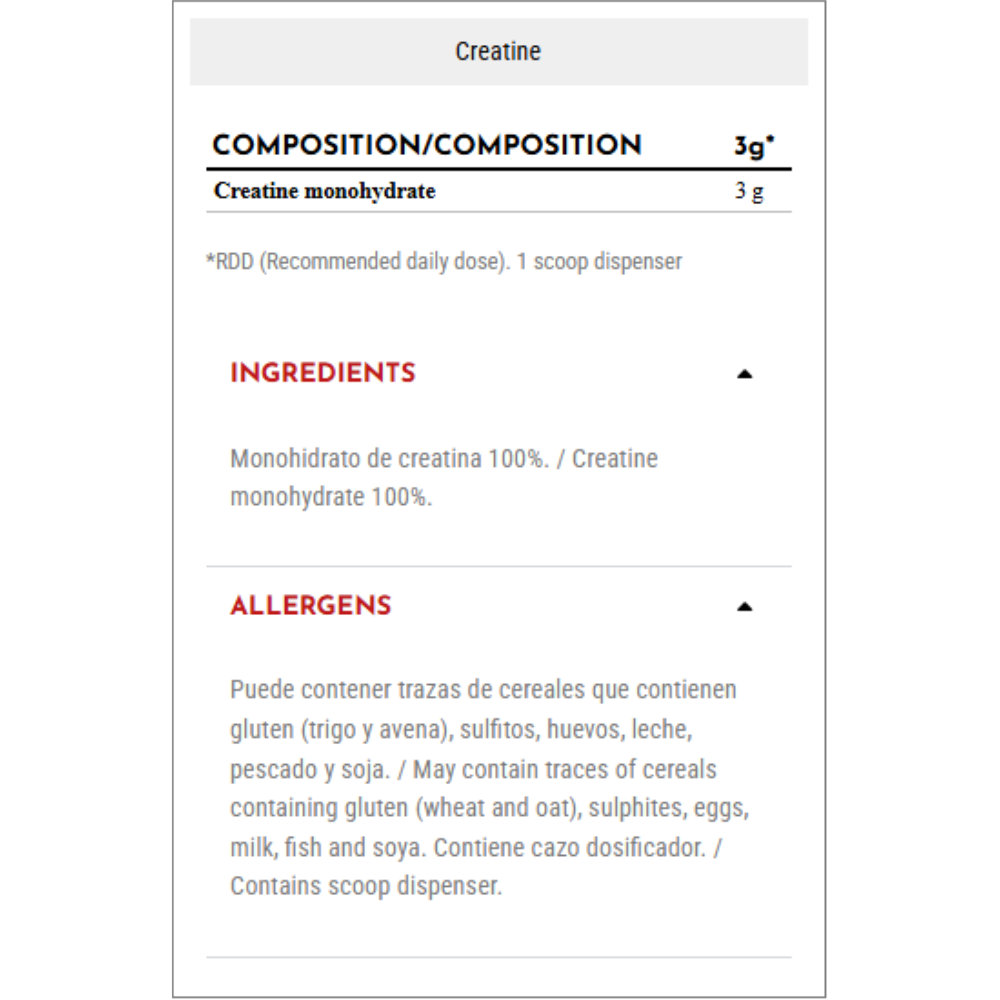 Ingredients: Creatine hydrochloride, dicreatine malate, beta-alanine (CarnoSyn®), cherry flavour, creatine alpha-ketoglutarate, fenugreek powder, sweetener (sucralose), colour (azorubine).