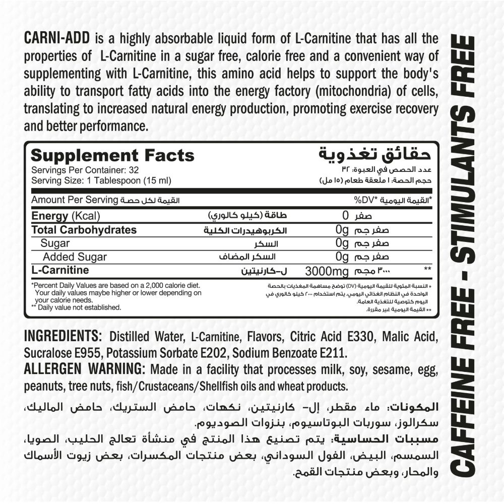 Unlock your body’s natural energy potential with MuscleAdd’s Carni Add. This is a highly absorbable, sugar-free, and caffeine-free liquid form of L-Carnitine. This powerful amino acid helps transport fatty acids into your cells’ energy factory (mitochondria) to be burned for fuel. Carni Add is the perfect, convenient way to support your athletic performance, promote exercise recovery, and aid in weight management.