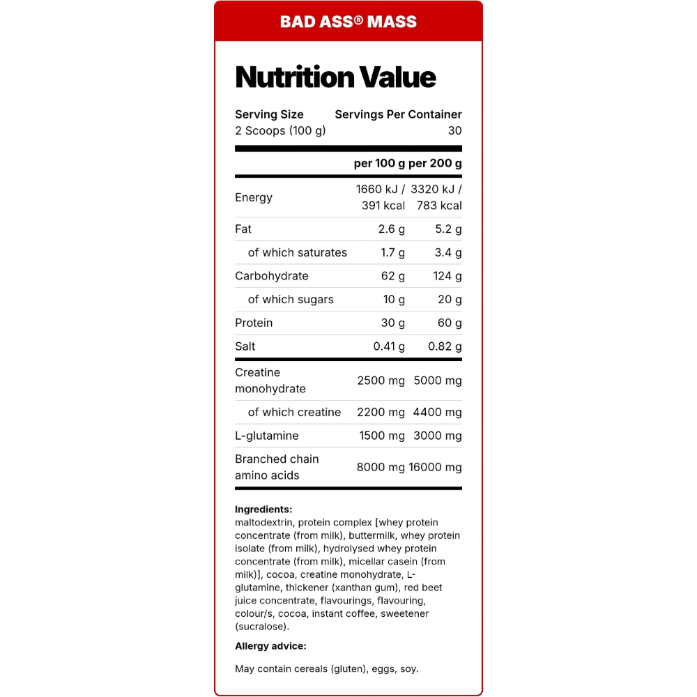Unleash your mass-gaining potential with BAD ASS® MASS, the new generation gainer. This powder is formulated for preparing a nutritional protein and carbohydrate drink, enriched with creatine and L-glutamine. Designed specifically for adults performing high-intensity exercise, BAD ASS® MASS provides the fuel you need to grow. Protein contributes to the growth and maintenance of muscle mass, while creatine increases physical performance in successive bursts of short-term, high-intensity exercise.