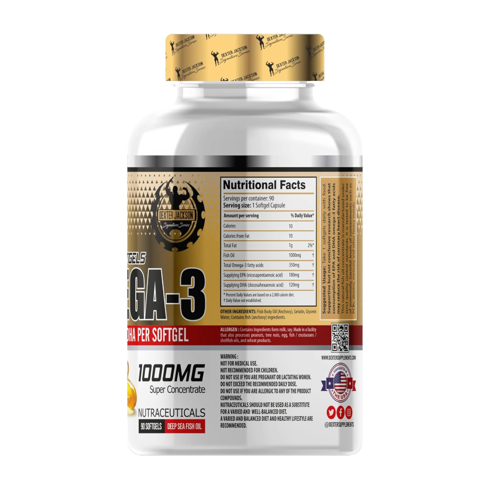 Support your overall health with Dexter Jackson Omega-3 Fish Oil Softgels. This super-concentrated formula provides 1000mg of deep-sea fish oil per softgel, delivering essential Omega-3 fatty acids, including EPA and DHA, crucial for various bodily functions. Part of the Dexter Jackson Signature Series.