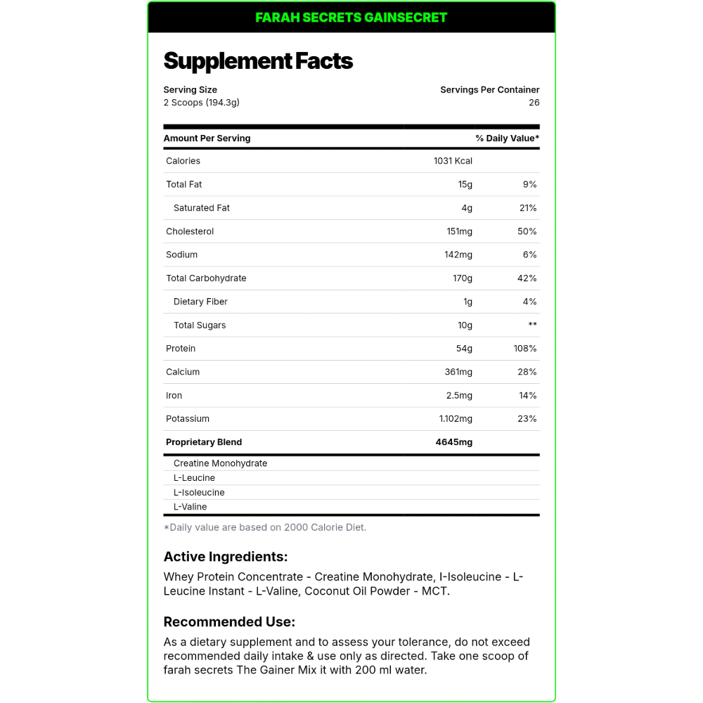 Farah Secrets Gain Secret is the premium muscle mass gainer you’ve been searching for. This advanced formula is scientifically engineered for individuals looking to pack on size and strength. With a powerful blend of protein, carbohydrates, and essential nutrients, Gain Secret is your ultimate partner in achieving your mass-building goals.