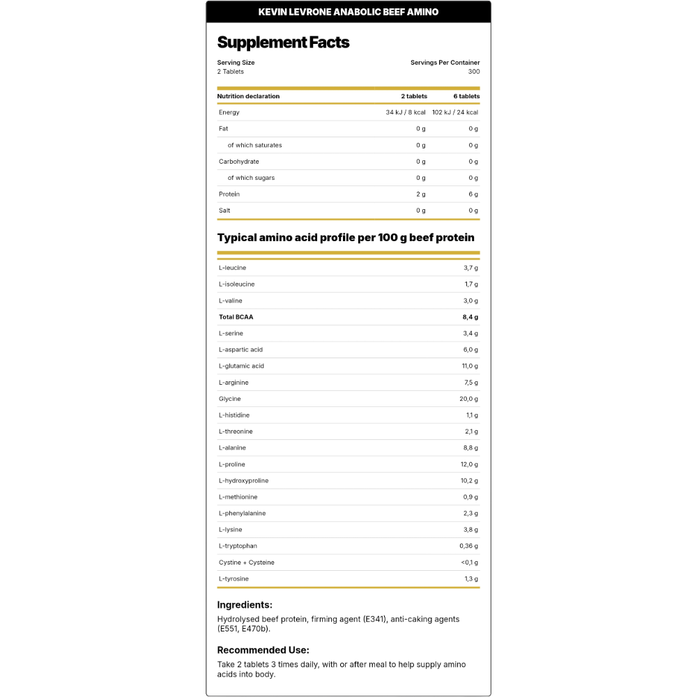 Kevin Levrone Signature Series Anabolic Beef Amino is a high-potency amino acid supplement derived from hydrolysed beef protein. This powerful formula is designed to deliver a full spectrum of essential and non-essential amino acids to fuel your body, promote muscle growth, and accelerate recovery.