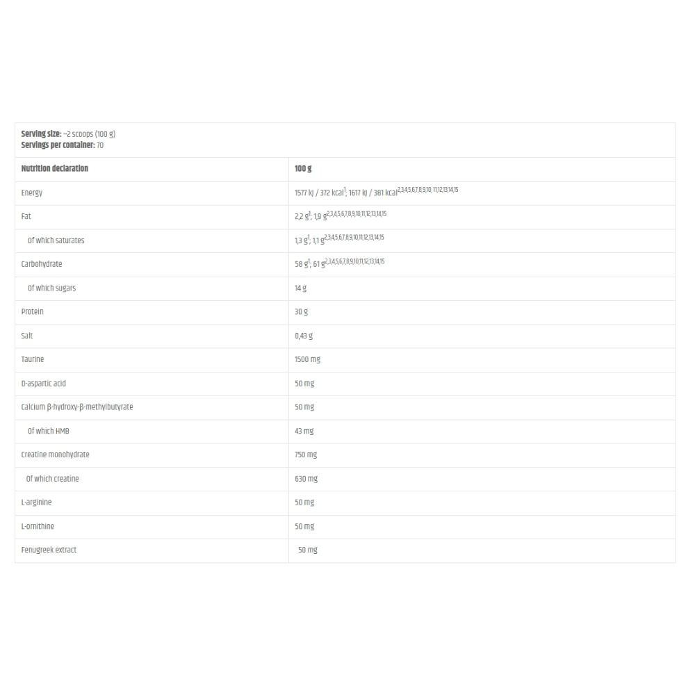 Ingredients: Maltodextrin, protein complex [whey protein concentrate 80% (from milk), buttermilk, whey protein isolate (from milk), hydrolysed whey protein concentrate (from milk), micellar casein (from milk)], cocoa, taurine, D-aspartic acid (DAA), calcium β-hydroxy-β-methylbutyrate (Ca HMB), creatine monohydrate, L-arginine, L-ornithine, Fenugreek extract (Trigonella foenum-graecum L.), thickener (xanthan gum), red beet juice concentrate, flavourings, instant coffee, colour/s, salt, sweetener (sucralose).