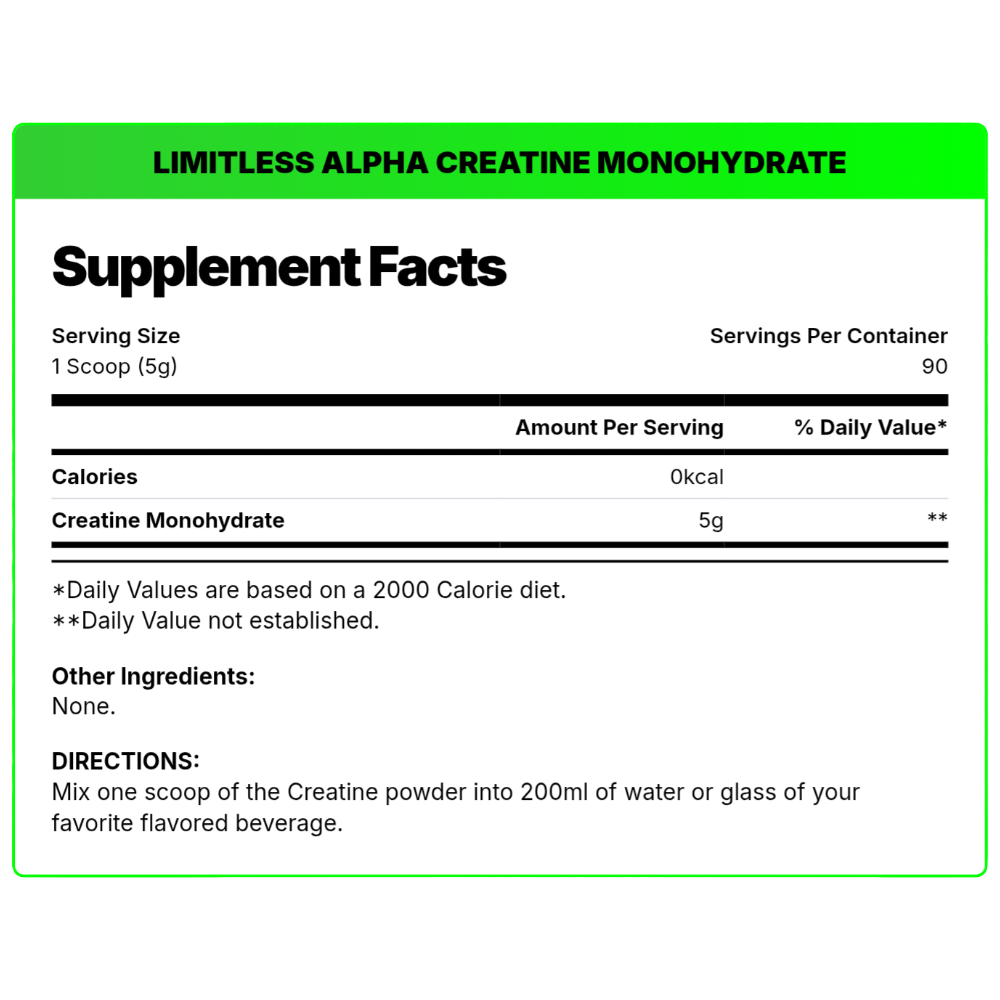 Unleash your inner alpha with Limitless Alpha Creatine Monohydrate. This 100% pure, micronized creatine is designed to support muscle power and enhance athletic performance. With 5g of pure creatine monohydrate per serving and zero calories, it’s the ultimate clean supplement to help you build strength, improve endurance, and achieve your fitness goals. Its unflavored and micronized formula allows for easy mixing with any beverage.