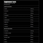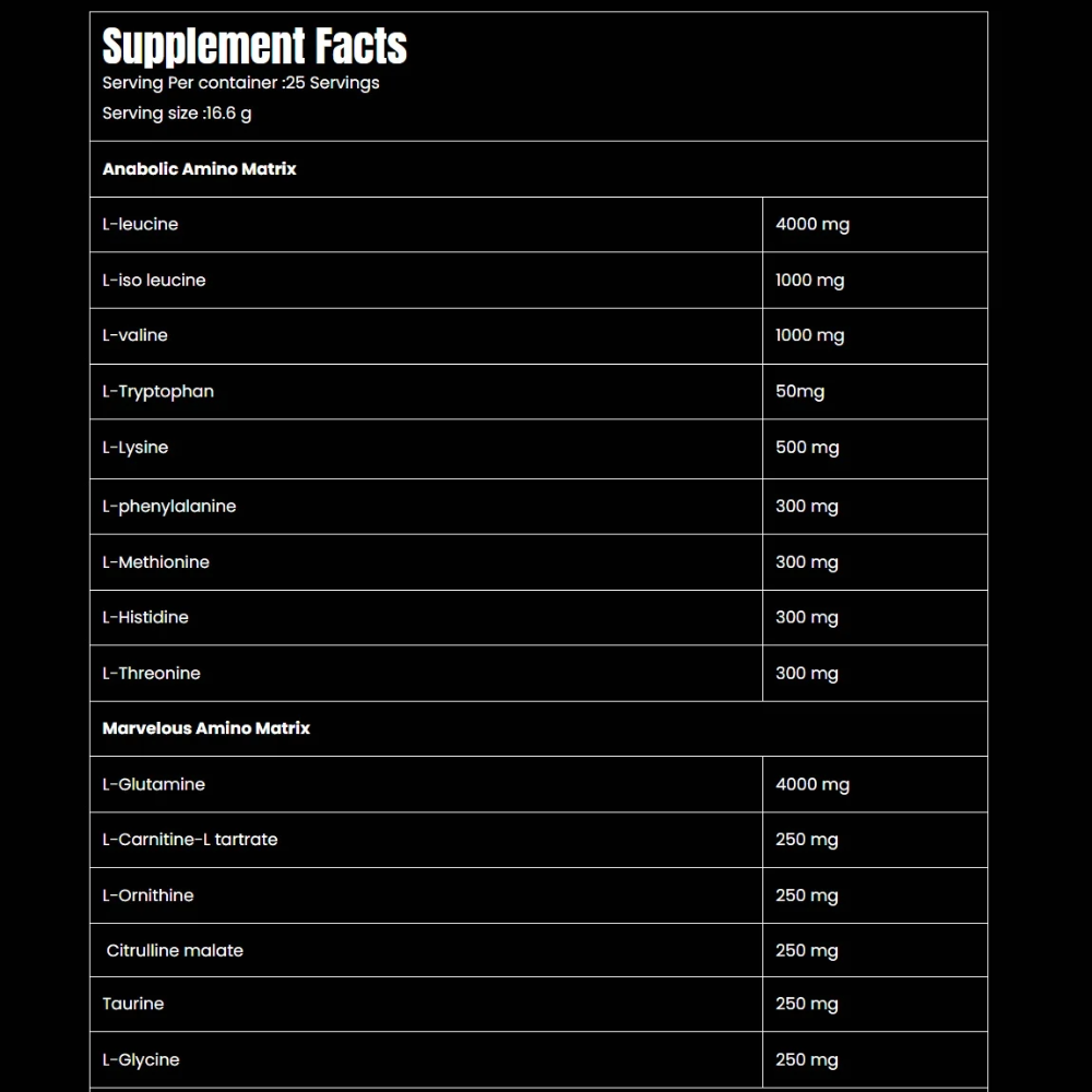 – L-Glutamine: 4000 mg, L-Carnitine-L-Tartrate: 250 mg, L-Ornithine: 250 mg, Citrulline Malate: 250 mg, Taurine: 250 mg, L-Glycine: 250 mg.
