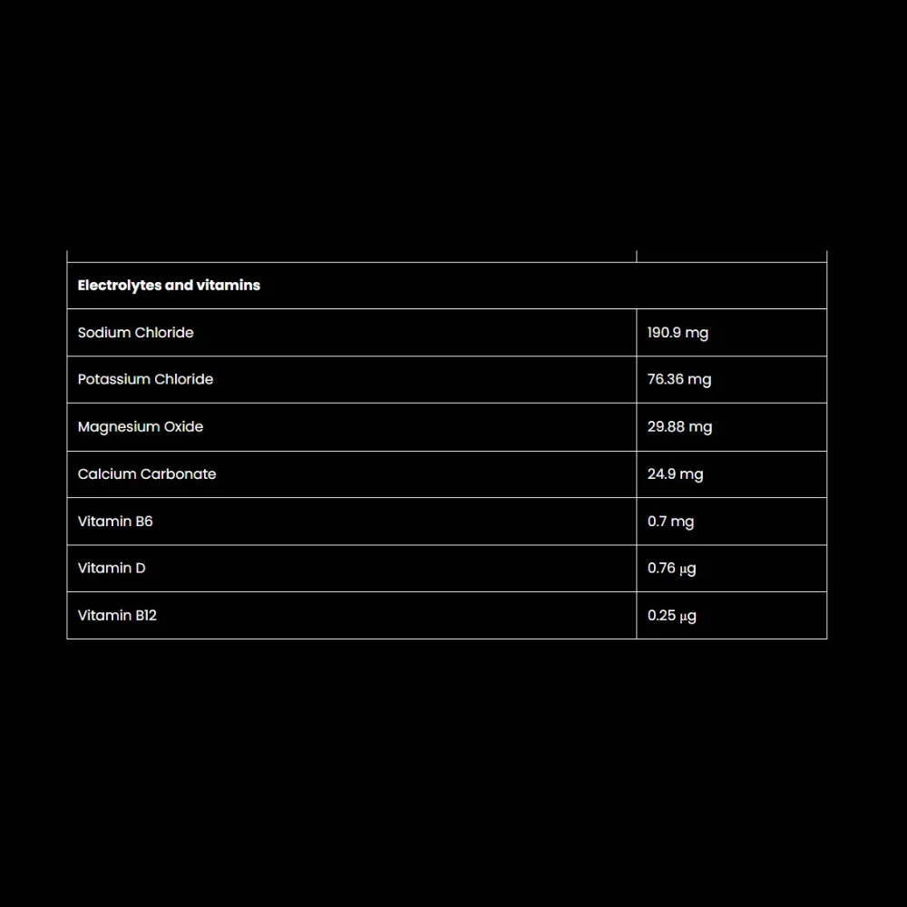 – Includes Sodium Chloride, Potassium Chloride, Magnesium Oxide, Calcium Carbonate, Vitamin B6, Vitamin D, and Vitamin B12.