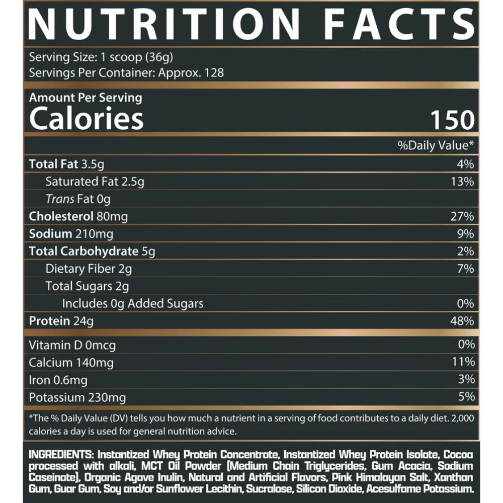 Ingredients: Instantized Whey Protein Concentrate, Instantized Whey Protein Isolate, MCT Oil Powder, Organic Agave Inulin, Natural and Artificial Flavors, Salt, Xanthan Gum, Guar Gum, Soy and/or Sunflower Lecithin, Sucralose, Acesulfame Potassium. (Ingredients vary slightly between flavors).