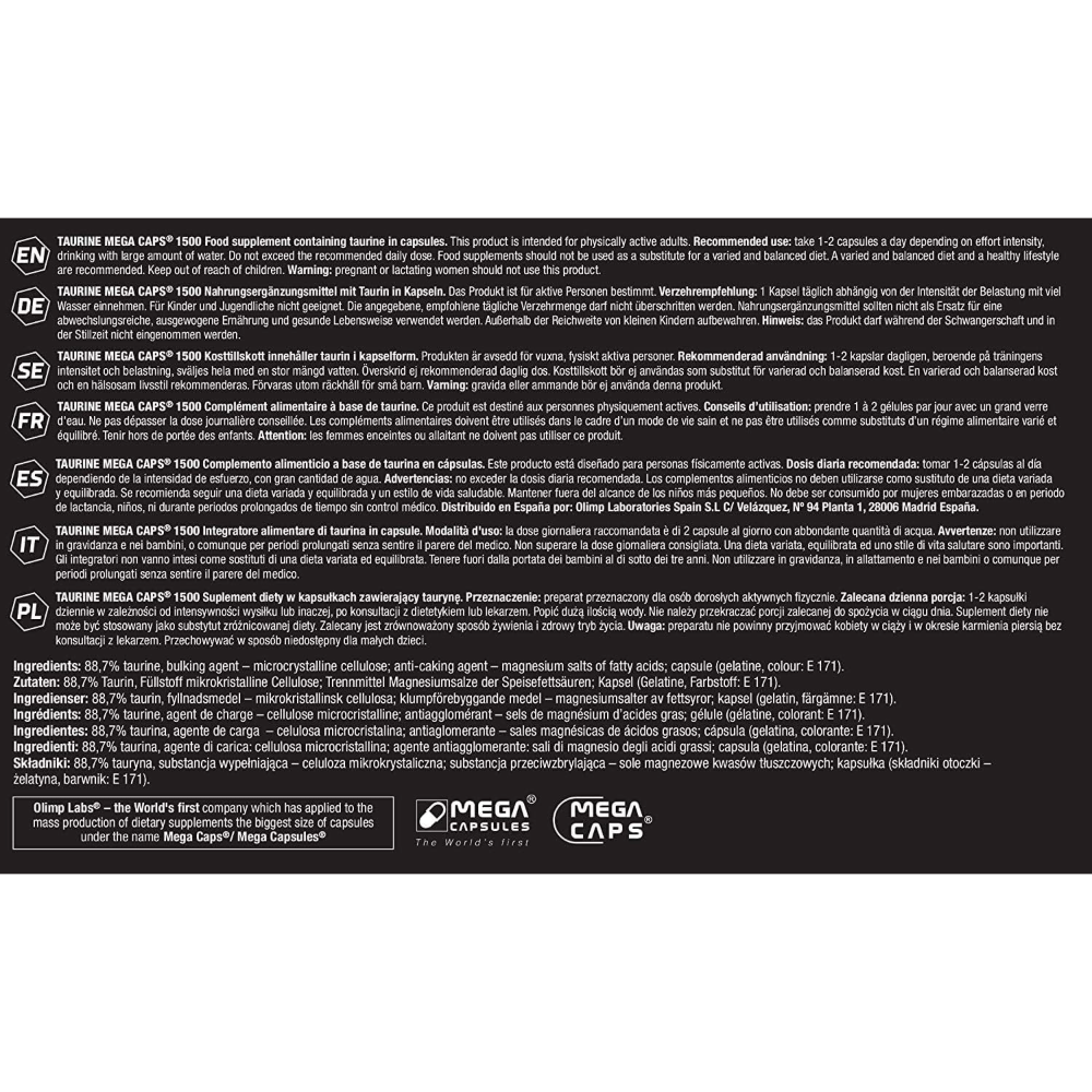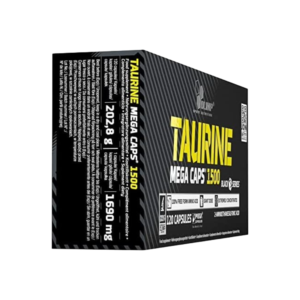 Olimp Taurine Mega Caps 1500 is a high-quality food supplement designed for physically active adults. Each capsule delivers a massive 1500 mg dose of taurine, an extremely concentrated, 100% free-form amino acid. This powerful supplement is part of the Black Series and is designed to support you in achieving your fitness goals.