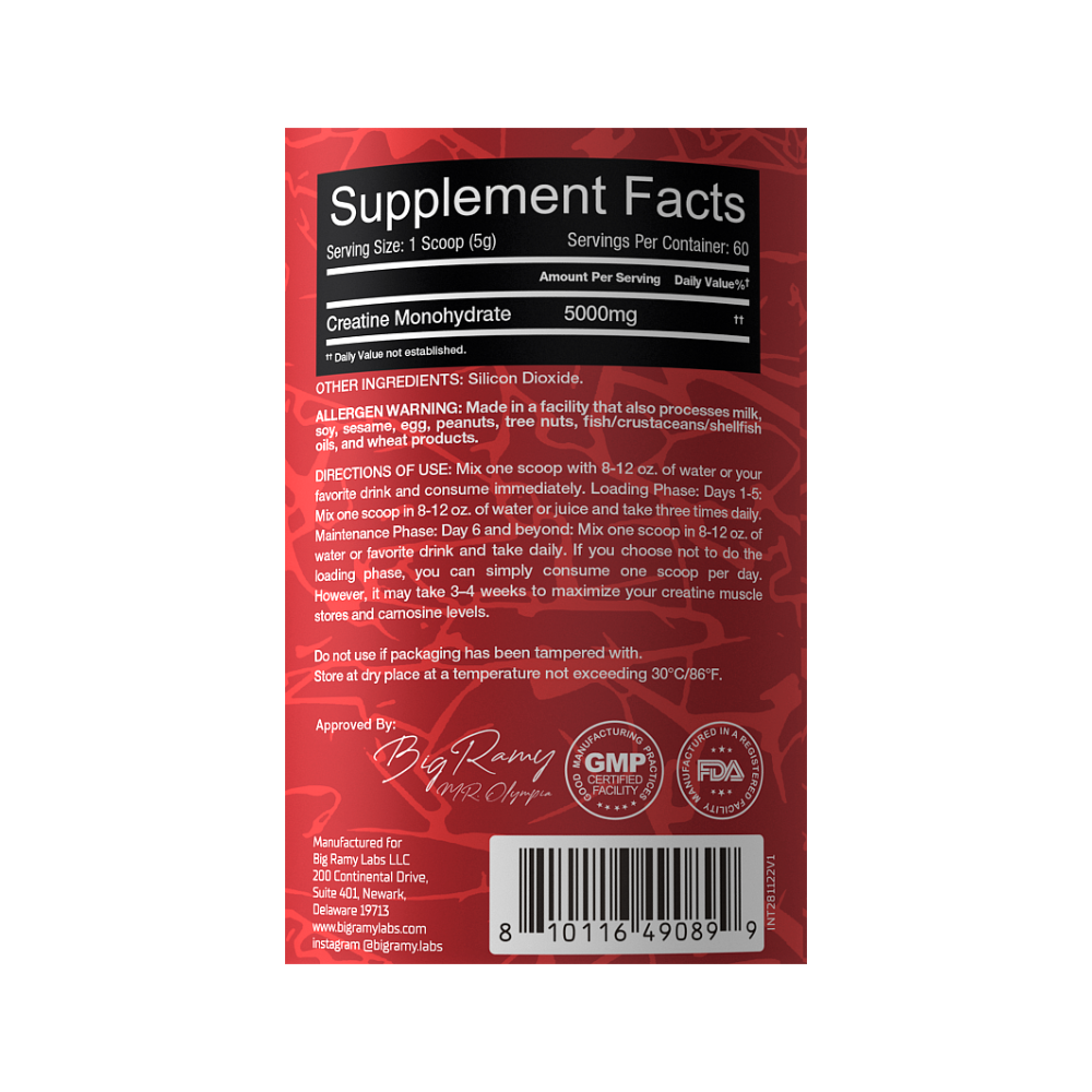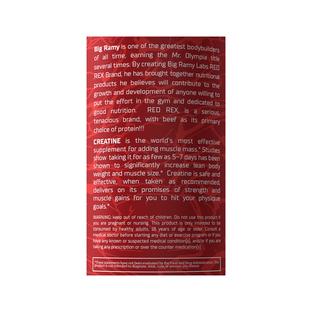 Amplify your strength, power, and muscle growth with Red Rex Creatine 5000mg by Big Ramy Labs. This is a pure, high-grade creatine monohydrate, one of the most researched and effective supplements for improving performance in the gym. Each serving provides a full 5g dose to saturate your muscles with creatine, leading to increased ATP production for more explosive strength and endurance.