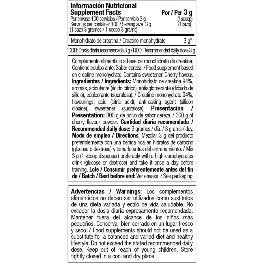Ingredients: Creatine Monohydrate. (Note: Flavored versions will contain additional ingredients like flavorings and sweeteners).